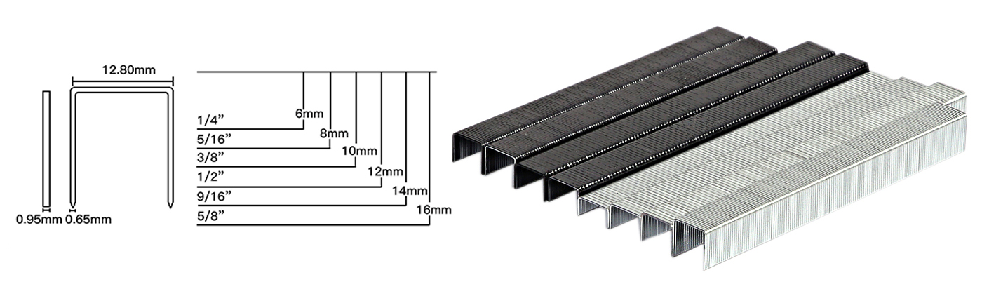 This staple features a wire diameter of 0.95mm, a crown width of 12.8mm, a leg thickness of 0.65mm, and a leg length of 16mm. The relatively thin leg design and appropriate thickness help reduce splitting force on the fastened materials. Each box contains 10,000 pieces, and the standard master carton holds 10 boxes per case, simplifying storage and logistics management.